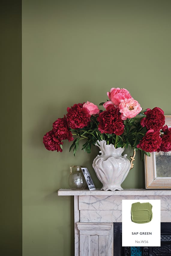 Sap Green, taken from the underside of a butterfly wing, creates a calm and inviting room, perfect for a living room or dining room.